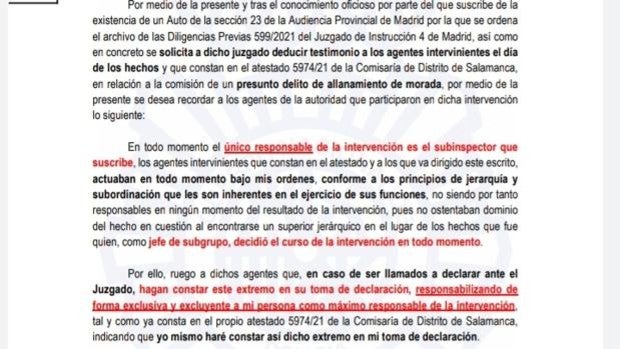 «Estoy muy contento, un notición. ¡Qué ganas tenía de que mis compañeros salieran de la causa! ¡No tenía ningún sentido que los mantuvieran en ella!», afirma a ABC el subinspector al frente del operativo que, durante la pandemia, irrumpió en un piso de la madrileña calle Lagasca en el que se celebraba una fiesta ilegal. Sus moradores se negaron a abrir la puerta a los agentes e identificarse. El subinspector responde así después de conocerse que el titular del Juzgado de Instrucción número 28 de Madrid ha ordenado el archivo de la causa abierta contra cinco de los seis policías nacionales del operativo. Ahora será solamente él quien tendrá que sentarse en el banquillo de los acusados. «Llevo ni se sabe el tiempo diciendo que mis compañeros no tenían que estar en la causa», continúa el agente, policía nacional desde 2003. «Se lo he dicho a la Fiscalía, al juez de instrucción en mi declaración, en el atestado de mi comparecencia lo puse: 'Yo era el responsable, el que di la orden'». «Lo he dicho hace mil veces -insiste- y a los compañeros les envíe su día una nota interna, firmada digitalmente con mi carné profesional de policía, en el que recordaba que era yo quien había dado la orden y que era yo el único responsable de ella». En esa nota interna, a la que ha tenido acceso ABC, el subinspector resalta en negrita que los agentes «actuaban en todo momento bajo mis órdenes, conforme a los principios de jerarquía y subordinación que les son inherentes en el ejercicio de sus funciones». Y concluye su escrito rogando que se responsabilice «de forma exclusiva y excluyente a mi persona como máximo responsable de la intervención», unas palabras que subraya en rojo. «¿Para qué soy subinspector?» En sus declaraciones a este periódico, lamenta que «nadie me había escuchado». «Entonces, ¿para qué hay jerarquía y subordinación? ¿Para qué soy mando? ¿Para qué soy subinspector? ¿Para cobrar más a final de mes y no responsabilizarme de mis decisiones y de mis órdenes?», se pregunta el agente. «Es que no tiene sentido. No tiene sentido que, si yo doy una orden a un policía y el policía no la ejecuta, se enfrenta a un expediente disciplinario», pone de ejemplo. «Pero resulta que si la ejecuta, y yo teóricamente me he equivocado y no es una orden adecuada, como sostiene la Audiencia de Madrid, responsabilizan también al policía. ¡No puede ser así! Entonces, ¿para qué hay jefes?», se cuestiona. A juicio del subinspector, con la decisión judicial de cerrar la causa contra sus cinco compañeros «empieza a imperar el sentido común». Y cree que «ésta es la primera de las muchísimas victorias que van a venir a continuación. Porque todo lo que pase de aquí en adelante va a ser a favor nuestro; al final, tarde o temprano me van a dar la razón porque intervine con la legalidad vigente; en base a la ley y en base a derecho». Considera que «se creará un precedente; se van a callar muchas bocas y se va a demostrar que esa intervención se hizo bien». «Ya está dado el primer paso, que ha sido quitar a mis compañeros; me he quitado esa gran carga psicológica de pensar que los estaba arrastrando conmigo; y, con esta decisión judicial, estoy encantado, estoy en una nube», concluye el agente, quien recuerda los valores que le enseñó su padre, policía nacional jubilado: «La lealtad, la responsabilidad y el sacrificio».